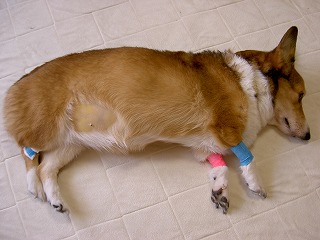 足のテープが痛々しい。お腹も黄疸で黄色。